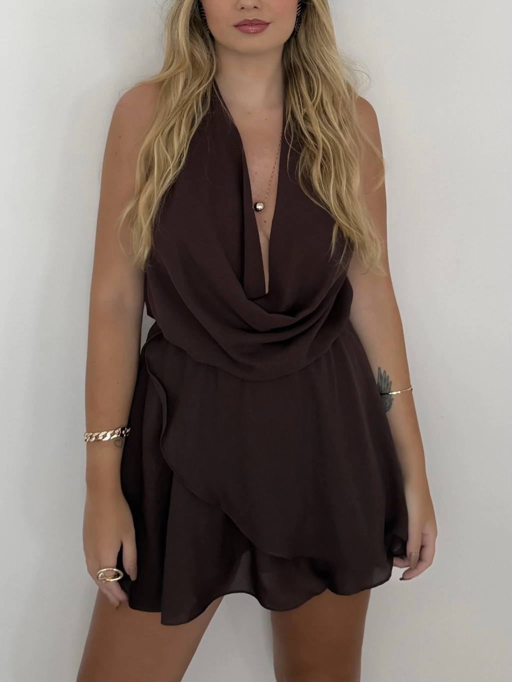 O macaquinho em crepe é a escolha perfeita para quem busca leveza, feminilidade e elegância em uma única peça. Com decote transpassado que valoriza o colo e camadas delicadas que criam um movimento suave. Possui elástico na cintura e Costas abertas
